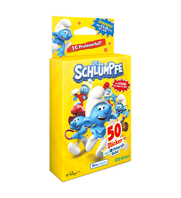 Eco-Blister mit 10 Tüten aus der "Blue Ocean Schlümpfe 2022" Sticker-Kollektion. Jede Tüte enthält 5 Sammelbilder.