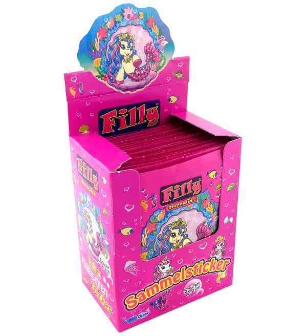 Ein Display aus der Filly Mermaids Sticker-Kollektion von Blue Ocean mit 50 Tüten. Jede Tüte enthält 5 Sammelbilder.