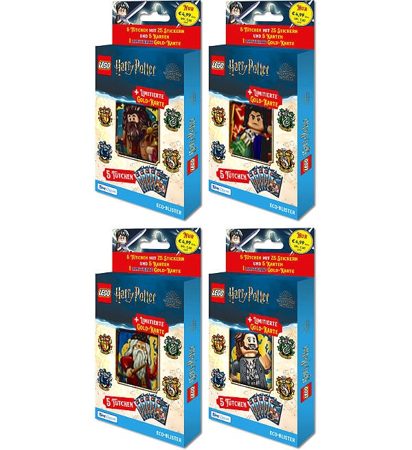 Alle 4 verschiedenen Eco-Blister aus der Sticker- & Cards-Kollektion "LEGO Harry Potter (2023)" von Blue Ocean mit insgesamt 20 Tüten (=100 Sticker + 20 Karten) plus diese 4 exklusiven Parallel-Karten: