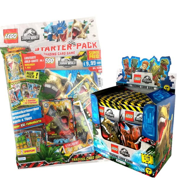 Starterpack + Display mit 50 Tüten des Lego Jurassic World Serie 2 Trading Card Game (2022). Jede Tüte enthält 5 Karten, somit sind in der Box insgesamt 250 Lego Jurassic World Cards.