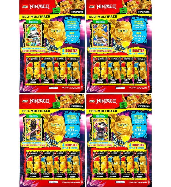 Alle 4 verschiedenen "Lego Ninjago Serie 8 NEXT LEVEL Eco-Multipack" mit insgesamt 16 Tüten (=96 Karten) und diesen 4 LE-Karten: