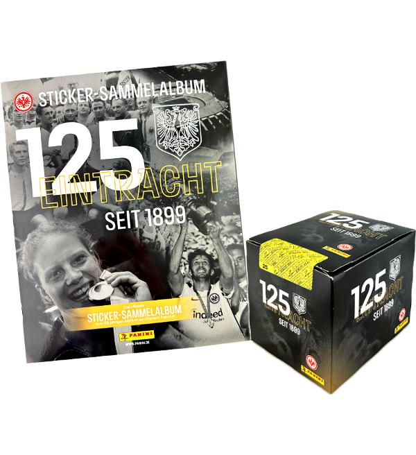 Album + 1 Display (=50 Tüten) aus der Panini 125 Jahre Eintracht Frankfurt Sticker-Kollektion. Jede Tüte enthält 5 Sammelbilder.