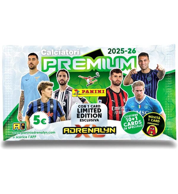 Premium Pack zur "Panini Calciatori Adrenalyn XL 2025-26" Trading Card Serie mit folgendem Inhalt: