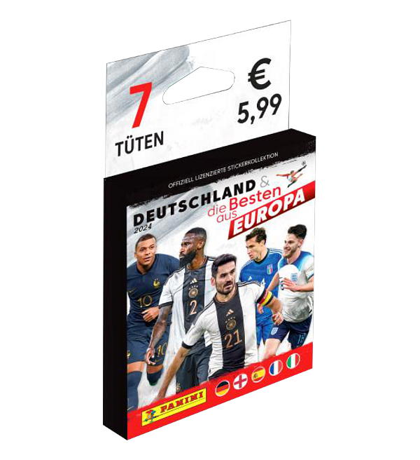 1 Eco-Blister (=7 Tüten) aus der Panini Deutschland & die Besten aus Europa 2024 Sticker-Kollektion. Jede Tüte enthält 6 Sammelbilder.