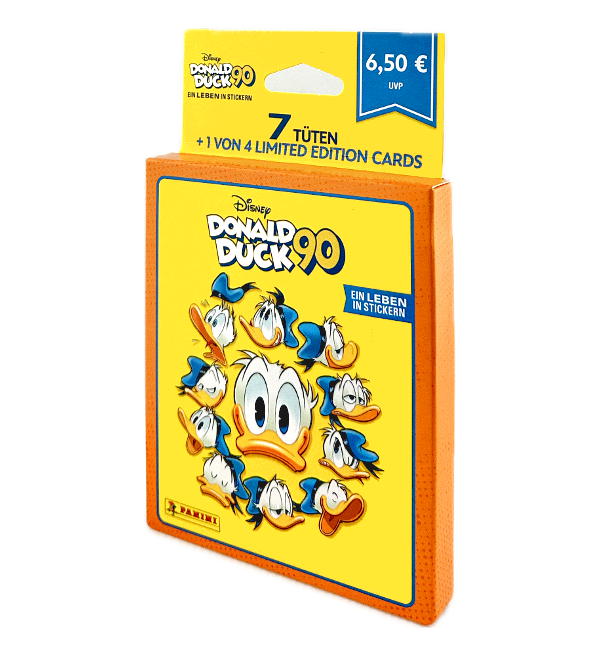 1 Display (=7 Tüten + 1 Limited Edition Card) aus der "Panini Donald Duck 90" Sticker & Cards Kollektion (2024). Jede Tüte enthält 4 Sammelbilder + 1 Trading Card.