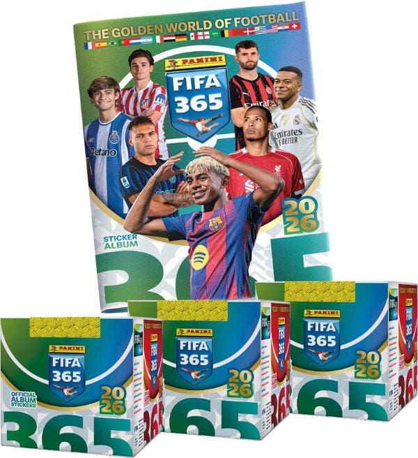 Album + 3 Displays (=108 Tüten) aus der "Panini FIFA 365 2026" Sticker-Kollektion. Jede Tüte enthält 5 Sammelbilder.