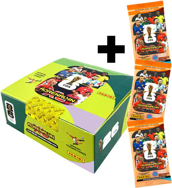 Display mit 24 Tüten + 3 Limited Edition Bonus Packs zur "Panini FIFA™ World Cup 2026 Adrenalyn XL" Trading Card Kollektion. Jeder Booster enthält 8 Karten, somit sind in der Box insgesamt 192 Cards enthalten. Jedes Limited Edition Bonus Pack enthält 4 Karten (2 Base, 1 Special & 1 Limited Edition Card).
