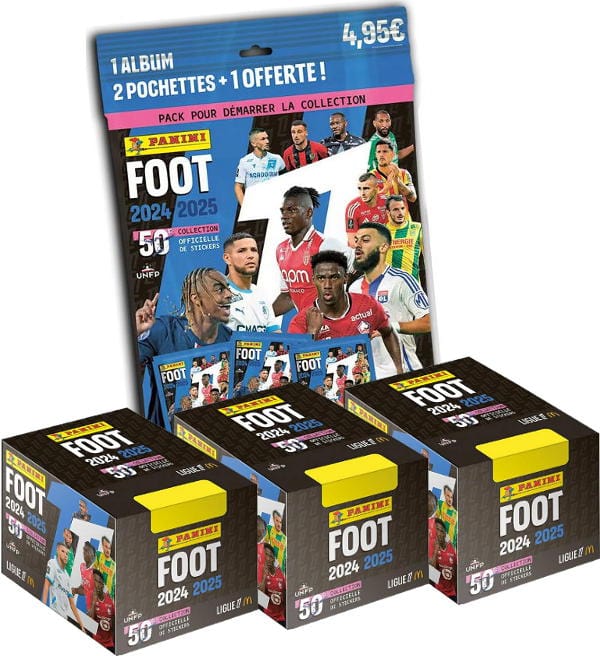 Starter Pack + 3 Displays (=150 Tüten) aus der "Panini Foot 2025 Ligue 1" Sticker-Kollektion. Jede Tüte enthält 7 Sammelbilder.