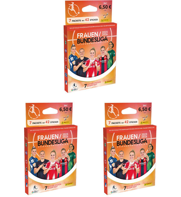 3 x Eco-Blister (=21 Tüten) aus der Panini Frauen Bundesliga 2025-2026 Sticker-Kollektion. Jede Tüte enthält 6 Sammelbilder.