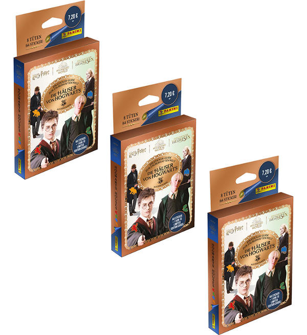 3 x Eco-Blister (=24 Tüten + 3 Limited Edition Cards) zur Panini Harry Potter Die Häuser von Hogwarts Sticker-Kollektion. Jede Tüte enthält 4 große Sticker mit 8 verschiedenen Motiven (=192 Einzelsticker). Insgesamt können 200 Einzelsticker gesammelt werden.