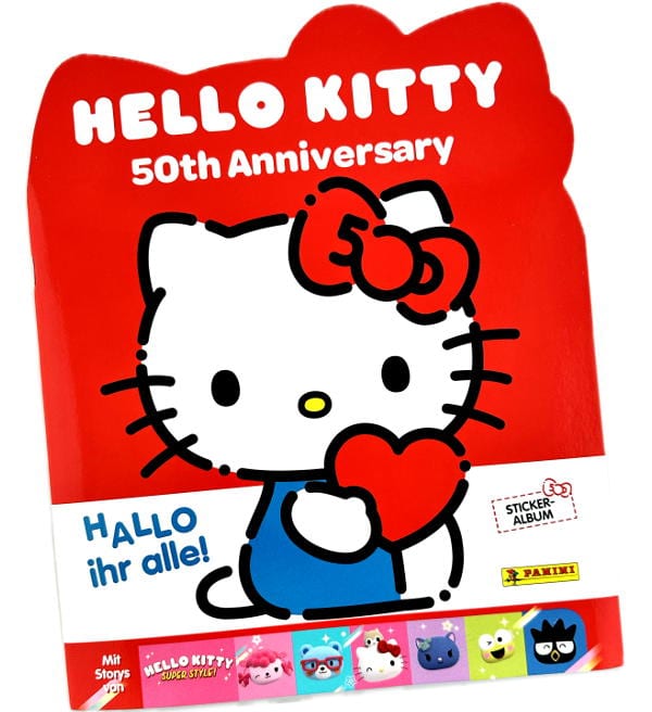 Sammelalbum zur Panini Hello Kitty 50th Anniversary Sticker-Kollektion mit 32 Seiten + 6 Gratis-Stickern + Poster. Insgesamt können 192 Sticker gesammelt werden, davon 48 Spezialsticker.