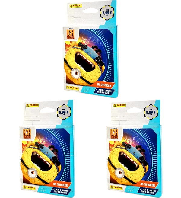 3 x Eco-Blister (=21 Tüten + 3 Limited Edition Cards) aus der Panini Ich Einfach Unverbesserlich 4 (Despicable Me 4) Sticker-Kollektion. Jede Tüte enthält 5 Sticker.