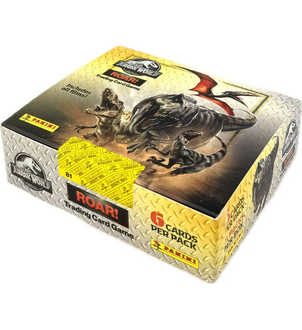 Display mit 24 Tüten zur "Panini Jurassic World ROAR" Trading Card Kollektion. Jeder Booster enthält 6 Karten, somit sind in der Box insgesamt 144 Cards enthalten.