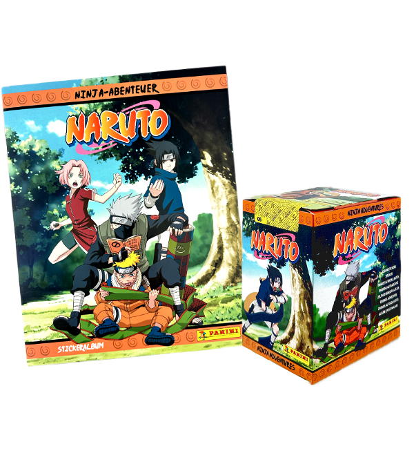 Album + Display mit 36 Tüten aus der "Panini Naruto Ninja Adventures" Sticker-Kollektion. Jede Tüte enthält 5 Sammelbilder.