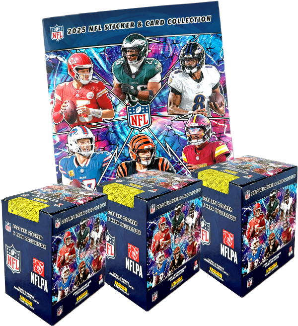 Album + 3 Displays (=150 Tüten) aus der "Panini NFL 2025" Sticker & Cards Kollektion. Jede Tüte enthält 5 Klebebilder + 1 Trading Card.