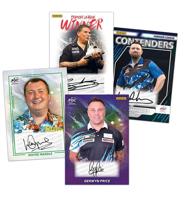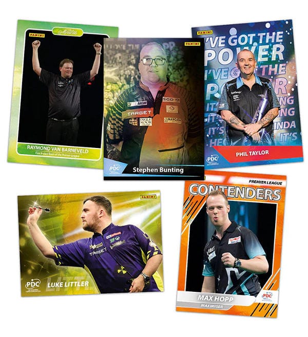 Premium Box mit 10 Boostern aus der "Panini PDC Premier League Darts 2025" Trading Card Kollektion. Jeder Booster enthält 8 Karten, somit sind in der Box insgesamt 80 Cards enthalten.