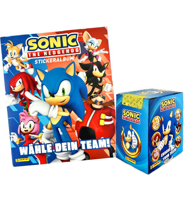Album + Display mit 36 Tüten aus der Panini Sonic the Hedgehog - Wähle dein Team Sticker-Kollektion. Jede Tüte enthält 5 Sticker.