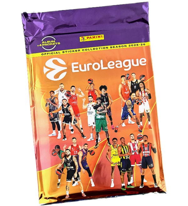 Starter Pack (Album + 4 Tüten) zur "Panini Turkish Airlines EuroLeague 2025-2026" Sticker-Kollektion. Jede Tüte enthält 5 Sammelbilder.