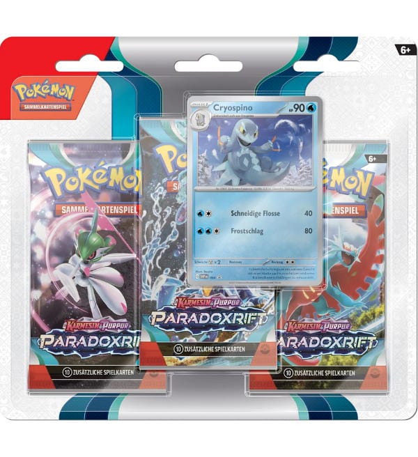 Ein 3-Pack-Blister (Version Cryospino) des Pokémon Erweiterungs-Sets "Karmesin & Purpur Paradoxrift" mit folgendem Inhalt: