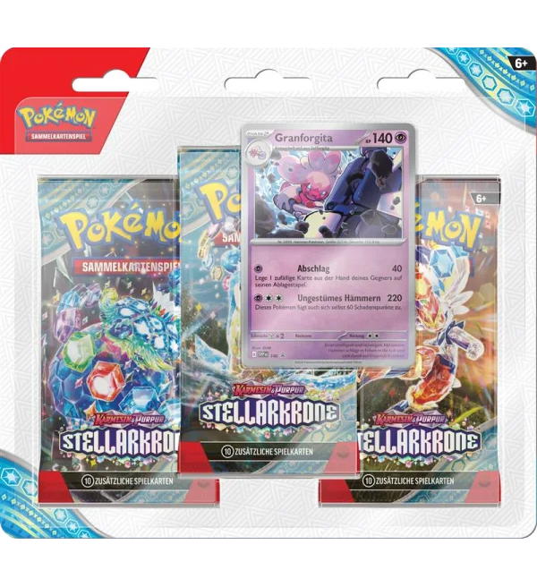 Ein 3-Pack-Blister (Version Granforgita) des Pokémon Erweiterungs-Sets "Karmesin & Purpur Stellarkrone" mit folgendem Inhalt: