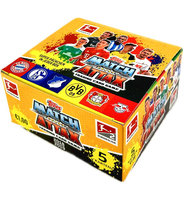 Display mit 50 Tüten zur Topps Bundesliga Match Attax 2018/19 Trading Card Kollektion. Jede Tüte enthält 5 Karten.