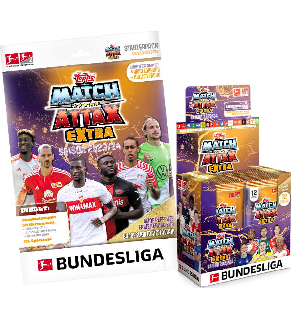 Starterpack + Display zur Topps Bundesliga Match Attax EXTRA 2023/24 Trading Card Serie mit folgendem Inhalt:
