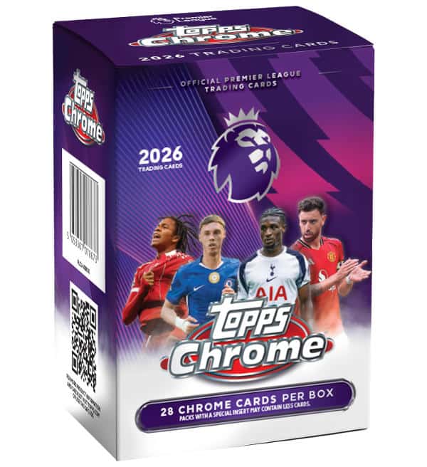 Value Box zur "Topps CHROME Premier League 2026" Trading Cards Kollektion mit folgendem Inhalt: