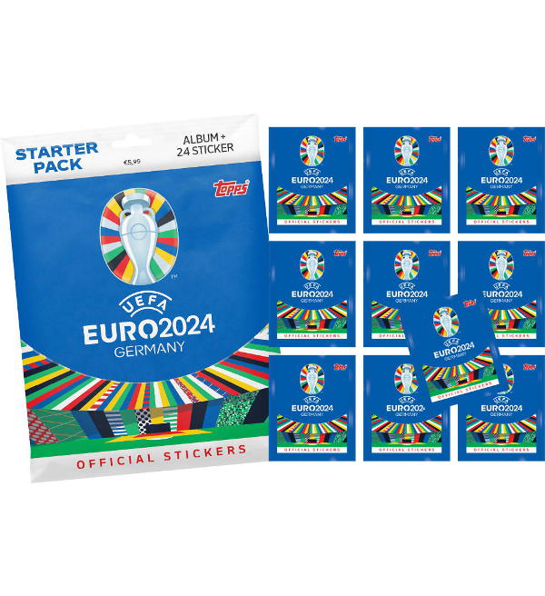 Starter Pack + 10 Tüten zur "Topps EURO 2024" Sticker-Kollektion mit folgendem Inhalt: